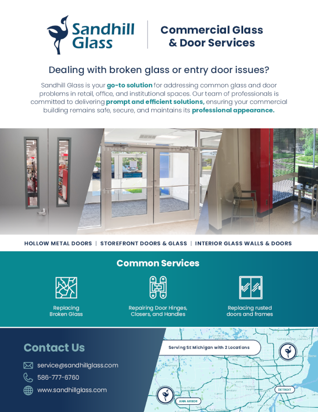 Contact us today at (734) 426-5600 for your commercial glass installation and replacements. Don’t worry about accurate measurements or glass types when you have professionals on the job.