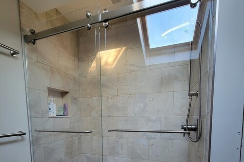 When selecting a barn-style door, you can choose between two sliding panels or one sliding panel paired with a stationary panel. The best choice depends on the layout of your bathroom—particularly the location of your shower controls and any fixtures like vanities or toilets near the door.